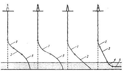 1 – участок набора зенитного угла; 2 – участок стабилизации зенитного угла; 3 – участок снижения зенитного угла; 4 – участок набора зенитного угла; 5 – горизонтальный забой скважины