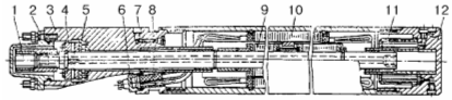 1 – соединительная муфта; 2 – крышка; 3 – головка; 4 – пятка; 5 – подпятник; 6 ‑ крышка кабельного ввода;7 – пробка; 8 – колодка кабельного ввода; 9 – ротор; 10 – статор; 11 – фильтр; 12 – основание.