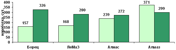 Анализ приведенной диаграммы показал наибольшую эффективность наработки на отказ зарубежных насосов по сравнению с отечественными. Наибольшая наработка на отказ наблюдается у фирмы Schlumberger – 1524 сут. Из отечественных насосов самая высокая наработка на отказ – Борец и Алмаз -326 и 299 суток соответственно.