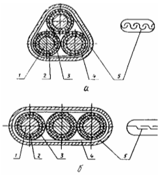 Кабель состоит из трех жил, каждая из которых имеет слой изоляции и оболочку; подушки из прорезиненной ткани и брони. Три изолированные жилы круглого кабеля скручены по винтовой линии, а жилы плоского кабеля - уложены параллельно в один ряд.