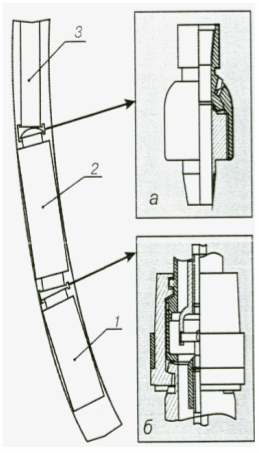 а – устройство шарнирное; б-шарнирно-кулачковая муфта; 1-погружной электродвигатель; 2-ЭЦН; 3-НКТ