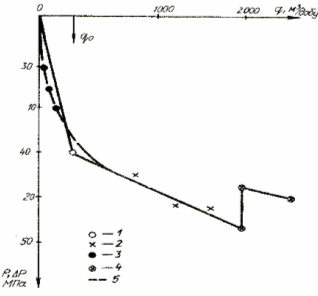1. точка, одержана побудовою; 2 – режими ГРП; 3-дослідження свердловини на приймальність; 4 – режими ГРП при закріпленні тріщин; 5 – гіпотетична зміна приймальності.