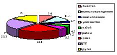 Второй по значимости является категория ДТП и других преступлений, чей удельный вес в общей структуре достигает 38,3%. Агрессивно-насильственные преступления представляют относительно немногочисленную категорию с удельным весом в 27,7%, объединяющую такие составы, как умышленное убийство, причинение телесных повреждений, изнасилования и хулиганство. Среди указанных преступлений наиболее распространенными являются причинение телесных повреждений (11,1%) и умышленное убийство (9,4%). Категории изнасилований и хулиганства занимают соответственно 2,7% и 4,5%.