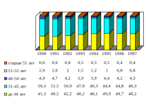 Анализ данных Департамента работы с персоналом МВД Украины показывает, что если в период 1995-1997 гг. рост дисциплинарных проступков и преступлений среди личного состава был непосредственно связан с расширением рядов ОВД, то сегодня это происходит скорее за счет размывания профессионального ядра. Кадровые реформы последних лет обозначили явную тенденцию к омоложению личного состава, что не может быть оценено однозначно положительно (рис. 25).