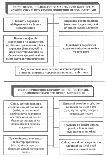 План расследования на первоначальном этапе должен предусматривать проверку не только обычных версий, свойственных расследованию преступлений определенного вида, но и таких версий: является ли подозреваемый несовершеннолетним; совершил ли он преступления один или в группе; нет ли в этой группе взрослых организаторов, подстрекателей; не было ли совершено подозреваемым несовершеннолетним аналогичных нераскрытых или еще не выявленных преступлений.