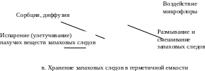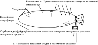 Нужно иметь в виду, что запаховые следы, оставляемые человеком, неравнозначны, их качественные и количественные характеристики зависят от природы следовоспринимающего объекта, условий образования и последующего периода выветривания. Запаховые следы лучше сохраняются на холоде, в тени, в закрытых помещениях, на шероховатых поверхностях; хуже - на ветру, на нагретых и гладких объектах, на гладких предметах из стали и стекла. Запаховые следы, образовавшиеся при кратковременном контакте человека с предметами, равно как и следы обуви, (менее 30 минут), сохраняются лишь в течение нескольких часов после их образования. Практика показывает почти полную бесперспективность исследования запаховых следов, образованных на полу помещений, на новых (не заношенных, не захватанных руками), на "чужом" постельном белье, на стеклянных или гладких металлических изделиях, на следоносителях, извлеченных из воды или имеющих следы плесени, признаки гнилостных изменений.