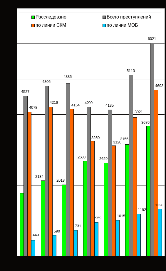 | Расследовано | 1779 | 2134 | 2018 | 2680 | 2629 | 3155 | 3676 |
