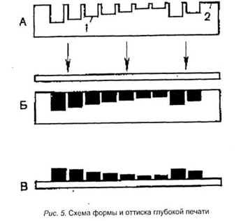 В формах для глубокой печати печатающие элементы расположены ниже пробельных и имеют, как правило, различную глубину, а пробельные элементы расположены в одной плоскости. Разная глубина печатающих элементов позволяет получать изображения различной тональности (рис. 5).