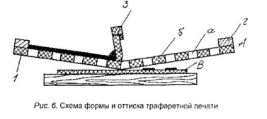 Процесс печатания с формы трафаретной печати (А) сводится к следующему: на сетку (1), закрепленную на раме (2), покрытую светочувствительным слоем, экспонируют позитив, затем при проявлении форма задубливается, а участки слоя, не подвергшиеся действию света, вымываются водой, что приводит к образованию сквозных отверстий в трафарете (а). Пробельные элементы (б) краску не пропускают, так как закрыты красконепроницаемым веществом (рис. 6). Печатание производится вручную и механизированным способом. Краска через отверстия формы продавливается специальным ножом (ракелем) (3) вручную или автоматически. Толщина слоя краски на оттиске (В) одинакова на всех участках изображения.