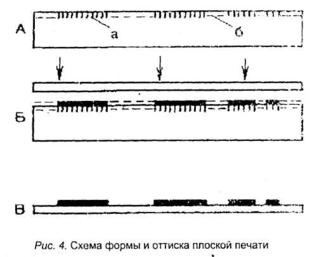 В форме плоской печати печатающие и пробельные элементы находятся в одной плоскости, но имеют разные физико-химические свойства (рис. 4).