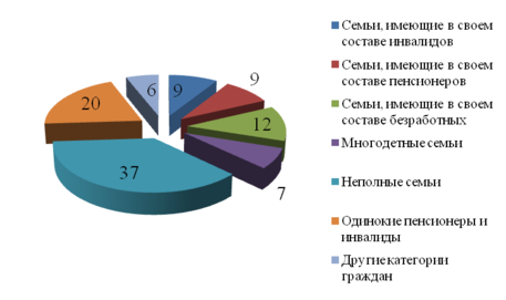 Также необходимо отметить, что в число социально незащищенных граждан попали не только традиционно малоимущие слои населения (инвалиды, пенсионеры), но и группы активного населения, попавшие в трудную жизненную ситуацию. Так, среди опрошенных получателей мер муниципальной поддержки были выделены следующие группы населения (см. рис. 2.1).