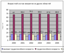 В частности, эта категория переселенцев имеет прогрессивную возрастную структуру. В 2000-2005гг. трудоспособных в их числе было 67%, а нетрудоспособных 16,7%. Причём это характерно как для межобластной, так и для межгосударственной миграций. (Таблицы 2,3).