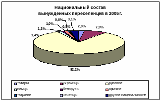 В связи с истечением пятилетнего срока действия статуса вынужденного переселенца с регистрационного учёта снято 13190 человек. Сейчас состоят на учете 325 семей или 707 вынужденных переселенцев. Среди них граждане 29 национальностей, 82,2% из которых составляют русские (таблица 17).