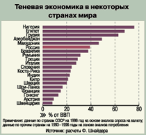 Масштабы теневой экономики огромны. Хотя измерить ее точно – непростая задача, ведь теневая экономика, собственно, и возникает из-за стремления избежать измерения, - ряд экономистов использует некоторые косвенные методы, позволяющие дать ей относительную оценку. Согласно исследования австрийского экономиста Фридриха Шнайдера, во второй половине 90−х годов в развитых странах теневая экономика была эквивалентна в среднем 12% ВВП, в странах с переходной экономикой — 23%, а в развивающихся — 39% ВВП.