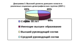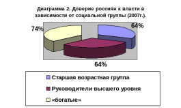 Рассмотрим вопрос доверия народа к власти. Процент доверия россиян к власти различен в зависимости от социальных групп: старшая возрастная группа (64%), руководители высшего уровня (64%) и "богатые" (74%). Причина повышенного уровня доверия СМИ у представителей старших возрастов объясняется сложившимися мировоззренческими стереотипами, привычкой верить всему, что сообщается СМИ. 52 В целом, чем выше уровень материального благосостояния респондентов, тем позитивней их оценки. Если среди респондентов с высоким уровнем личных доходов о пользе говорят 72%, то в группе малообеспеченных опрошенных только 20%. Соответственно, как вредную деятельность нижней палаты парламента расценивают 8% и 16% россиян, как бесполезную 42% и 47%.