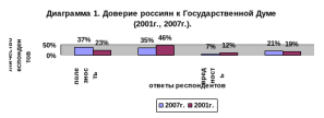 Из материалов социологических исследований51 известно, что уровень доверия населения страны государственным (помимо института президентства) и общественным институтам, в частности обеим палатам парламента во временной промежуток с 2001г. по 2007г. подрос незначительно. При этом недоверие россиян Государственной Думе весьма устойчиво во времени, и охватывает как период думской оппозиции президенту, так и современный этап конструктивного сотрудничества с исполнительной властью.