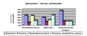 Данные таблицы 4 свидетельствуют о том, что среди авторов проанализированных публикаций в большинстве изданий преобладают журналисты. На втором месте - представители власти (конкретные чиновники или политики), на третьем - эксперты. Правда, бывают и исключения.