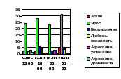 Приступаем к обсуждению полученных нами данных. Анализ вещания «Авторадио» дает следующее распределение рассматриваемых признаков. Если принять во внимание временной диапазон с 9-00 до 23-00 (ночной эфир фактически полностью сориентирован на водителей автомобилей, поэтому мы не анализировали вещание в этом временной диапазоне), то речевые сообщения (в информации политического характера, “народных новостях”, в заполнениях пауз, в рекламе) формируют распределение по шкале «Любовь – агрессия», отраженное на рис. 1. Если же ориентироваться на установки по рассматриваемой шкале, выраженные в музыкальных художественных текстах, то распределение выражается графиком, помещенным на рис. 2. Цифры даны в среднеарифметических показателях (частота проявления признака в выборке).