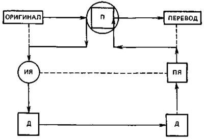 Воспринимая текст оригинала, переводчик отождествляет составляющие этот текст единицы с известными ему языковыми единицами ИЯ и, интерпретируя их значение в контексте, выясняет, какую ситуацию реальной действительности описывает оригинал. После этого переводчик описывает эту ситуацию на языке перевода. Таким образом, процесс перевода осуществляется от текста оригинала к реальной действительности и от нее к тексту перевода. В ряде случаев этот же процесс идет более кратким путем, когда интерпретация текста или какой-либо его части была проведена заранее, и переводчику известно, что определенные единицы ИЯ и ПЯ указывают на одинаковые предметы, явления или отношения реальной действительности. На этом основании он может непосредственно заменять единицы оригинала соответствующими единицами перевода, и обращение к реальной действительности осуществляется вне данного акта перевода (на схеме эти два случая обозначены соответственно сплошной и пунктирной линией). Модель перевода при этом сохраняет свою основную ориентацию: объяснение процесса перевода как обращение к описываемой ситуации.