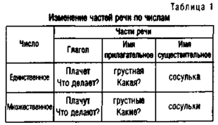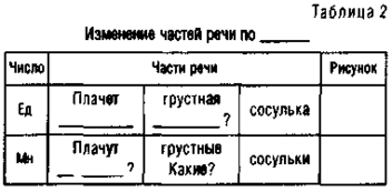 Пропуски в заголовке и в содержании таблицы определяют действия по ее заполнению. Задание по озаглавливанию таблицы направлено на формирование операции обобщения и усвоение принадлежности категории числа частям речи. Задание по озаглавливанию столбиков формирует умение выделять существенные свойства предмета и закрепляет знания, какие именно части речи изменяются по числам. Вписывание в клеточки таблицы вопросов совершенствует умение устанавливать грамматико-синтаксические связи в предложении и развивает операции замены и сопоставления. Рисование сосулек в последнем столбике учит соотносить явления действительности и значения грамматических категорий и развивает операции абстрагирования, конкретизации и переноса.