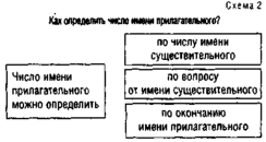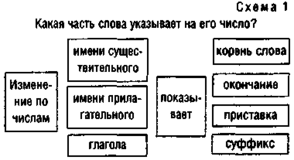 Логика наглядного пособия параллельна логике учебника. Далее предлагается конкретизировать знания о числе применительно к разным частям речи. Так, учащиеся самостоятельно заполняют своими примерами (можно использовать материалы учебника и таблиц) таблицы «Изменение имен прилагательных по зависимости от имен существительных», «Изменение числа глаголов». В этих таблицах стрелками указаны синтаксические связи, эти связи обозначены и в виде вопросов, поставленных от одного слова к другому. Заполнение таблиц заканчивается составлением выводов (схема 2).
