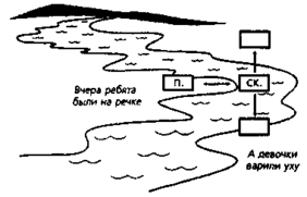 Далее дети подбирают сказуемое и второстепенный член, поясняющий этот главный член (ловили рыбу). Теперь остается добыть еще одно слово, которое будет в предложении первым (а значит, оно должно будет связывать по смыслу два предложения) и будет пояснять сказуемое. Учащиеся предложили следующий вариант: Там мальчики ловили рыбу.