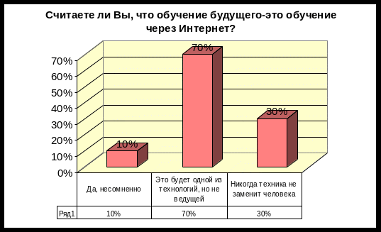 По результатам нашего опроса можно сделать вывод, что подавляющее число педагогов полагают, что Интернет - это одна из технологий ОИЯ, но они не придают ему ведущего значения.