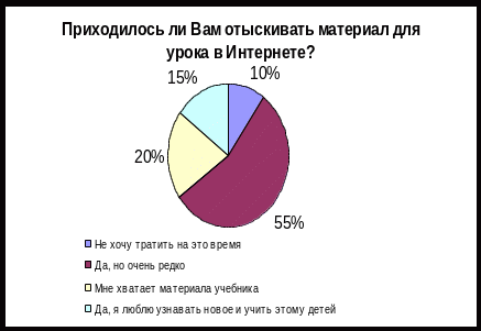 Подводя итоги по результатам анкетирования можно сказать, что в целом педагоги заинтересованы в том, чтобы использовать Интернет на своих уроках. Но, к сожалению, ни каждому учителю предоставляется такая возможность. Учителя нашей школы в основном используют компьютеры как пишущие машинки для набора и редактирования календарно-тематического планирования, дидактического материала, тестов в бумажном варианте, оформлении кабинета, обобщения опыта (разработка уроков, докладов). Лишь некоторые из педагогов осуществляют поиск материала к урокам в сети Интернет. Проанализировав ситуацию, сложившуюся в школе мы пришли к выводу, что у нас в школах слабо внедряются информационные технологии в учебный процесс.