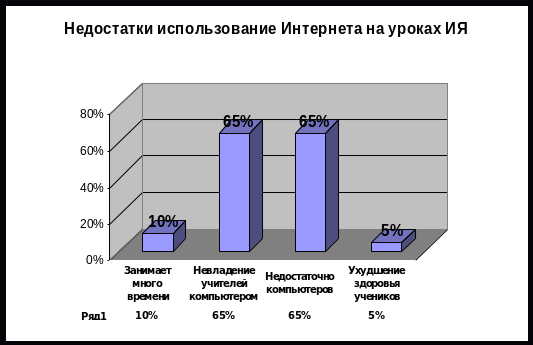 Надо отметить, что число сторонников Интернет могло бы быть больше, если бы не трудности и недостатки в его использовании. Приведённая ниже диаграмма отражает наиболее распространённые затруднения, которые по мнению опрошенных учителей встречаются в работе с Интернет.