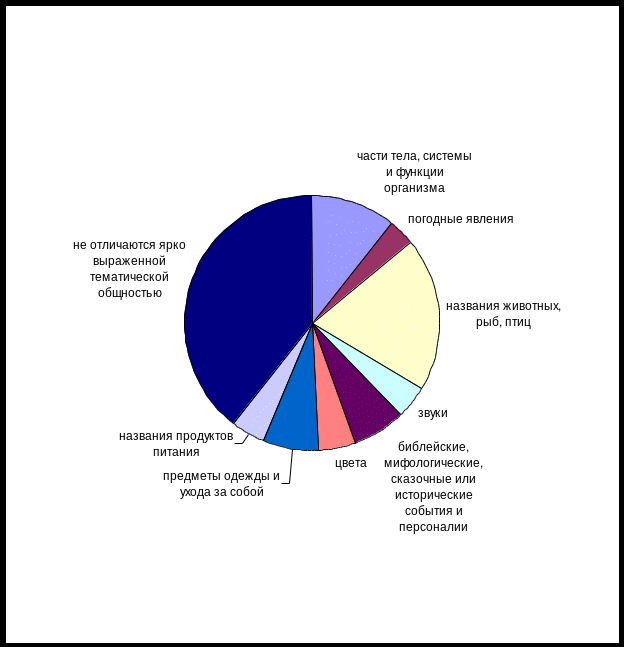 Так, проанализировав полученные данные, мы приходим к выводу о том, что автор употребляет весьма разнообразные ФЕ в своих произведениях. Но, так как около ½ всей выборки не могут быть подвергнуты данной классификации, можно сделать вывод, что принцип тематической классификации не может быть применен к всему корпусу исследуемых фразеологических единиц. Это связано с семантикой компонентов ФЕ и полностью подтверждает теорию о неразложимости компонентов фразеологических единиц. Те же фразеологические единицы, которые были классифицированы по данному признаку, являются не сращениями, а представляют собой фразеологические единства и фразеологические сочетания, в которых, согласно определению, данному акад. В.В.Виноградовым, отчетливо сохраняются признаки семантической раздельности компонентов.