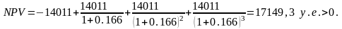Here and more low in work we will believe that 1 c.u. = 1$. We will notice also, what at the moment of 01.04.04 Central Bank rate of the Russian Federation of the American dollar made 28 rbl. 13 copeck Here in the first composed number 14011 of c.u. with a minus corresponds to the full cost price of the project, r=0,166, or, what the same, r=16,6 %? Level of profitability (profitableness) of the project. For our project the settlement size is more than zero, the project profitable means. 2) calculation of an index of profitability of investments (PI) Pays off a profitability index (Profitability Index) (PI) under the formula: