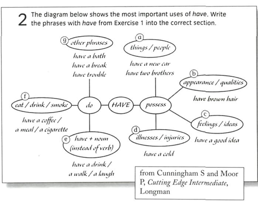 Ask learners to prepare 'collocation maps' of high frequency words and their collocates. Words like have, take, give, make and get lend themselves to this kind of treatment. They are often used in combination with nouns to form an expression which has a meaning of its own, as in have a look, take a break, give advice, make an appointment, so that the verb itself has little or no independent meaning. For this reason, they are called delexical verbs. Here, for example, is a collocation map for have, which shows its range of collocations organised into meaning categories: