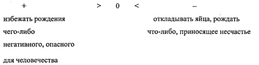 Опираясь на мнение О. И. Глазуновой о том, что в бинарных противоположных признаках (добрый - злой, умный - глупый) просматривается третий компонент, так называемый абсолютный нуль, при помощи которого значения нейтрализуются, можно определить, какой статус (положительный или отрицательный) несет метафора (Там же). Рассмотрим это утверждение на примерах метафор: