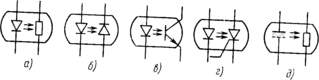 Основным структурным элементом оптоэлектронных устройств является оптрон - прибор, состоящий из источника и приемника света, связанных оптически. Поскольку схемотехнические возможности оптрона определяются главным образом характеристиками фотоприемника, этот элемент и дает название оптрона в целом. К важнейшим разновидностям элементарных оптронов относятся: транзисторные, диодные, резисторные и тиристорные (рис. 7).