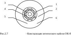 На сегодняшний день промышленностью выпускаются оптические кабели имеющие четыре и восемь волокон(марки ОК). Конструкция ОК-8 приведена на рис.2.7. Оптические волокна 1 (многомодовые, ступенчатые) свободно располагаются в полимерных трубках 2. Скрутка оптических волокон – повивная, концентрическая. В центре – силовой элемент 3 из высокопрочных полимерных нитей в пластмассовой трубке 4. Снаружи – полиэтиленовая лента 5 и оболочка 6. Кабель ОК-4 имеет принципиально те же конструкцию и размеры, но четыре ОВ в нем заменены пластмассовыми стержнями.