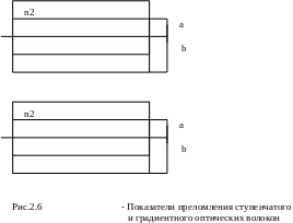 Различают световоды со ступенчатым профилем, у которых показатель преломления сердцевины n1 одинаков по всему поперечному сечению, и градиентные - с плавным профилем, у которых n1 уменьшается от центра к периферии (рис.2.6).