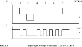 В современных оптоволоконных системах связи для городской телефонной сети ИКМ-120-4/5 и ИКМ-480-5 для передачи в качестве линейного кода используется код CMI, отвечающий большинству вышеперечисленных требований. Особенностью данного кода является сочетание простоты кодирования и возможности выделения тактовой частоты заданной фазы с помощью узкополосного фильтра. Код строится на основе кода HDB-3 (принцип построения представлен на рис.2.4). Здесь символ +1 преобразуется в кодовое слово 11, символ –1 –в кодовое слово 00, символ 0 -в 01. Из рисунка 2.4 видно, что для CMI характерно значительное число переходов, что свидетельствует о возможности выделения последовательности тактовых импульсов. Текущие цифровые суммы кодов имеют ограниченное значение. Это позволяет контролировать величину ошибки достаточно простыми средствами. Число одноименных следующих друг за другом символов не превышает двух – трех. Избыточность кода CMI можно использовать для передачи служебных сигналов.