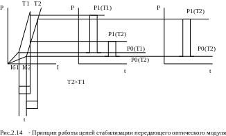 Преобразователь кода ПК преобразует стыковой код, в код, используемый в линии, после чего сигнал поступает на модулятор. Схема оптического модулятора исполняется в виде передающего оптического модуля (ПОМ), который помимо модулятора содержит схемы стабилизации мощности и частоты излучения полупроводникового лазера или светоизлучающего диода. Здесь модулирующий сигнал через дифференциальный усилитель УС-1 поступает в прямой модулятор с излучателем (МОД). Модулированный оптический сигнал излучается в основное волокно ОВ-1. Для контроля мощности излучаемого оптического сигнала используется фотодиод (ФД), на который через вспомогательное волокно ОВ-2 подается часть излучаемого оптического сигнала. Напряжение на выходе фотодиода, отображающее все изменения оптической мощности излучателя, усиливается усилителем УС-2 и подается на инвертирующий вход усилителя УС-1. Таким образом, создается петля отрицательной обратной связи, охватывающая излучатель. Благодаря введению ООС обеспечивается стабилизация рабочей точки излучателя. При повышении температуры энергетическая характеристика лазерного диода смещается (рис.2.14), и при отключенных цепях стабилизации мощности уровень оптической мощности при передаче «0» (Р0) и при передаче «1» (Р1) уменьшаются, разность тока смещения Iб и порогового тока Iп увеличивается, а разность Р1-Р0 уменьшается. После времени установления переходных процессов в цепях стабилизации устанавливаются новые значения Iб и Iп и восстанавливаются прежние значения Р1-Р0 и Рср. Для уменьшения температурной зависимости порогового тока в передающем оптическом модуле имеется схема термостабилизации (СТС), поддерживающая мощность излучения передающего оптического модуля постоянной при изменении температуры от номинального значения.