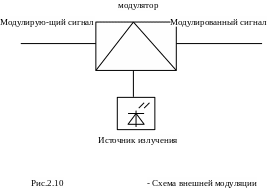 Внешняя модуляция. В этом случае для изменения параметров несущей используют модуляторы, выполненные из материалов, показатель преломления которых зависит от воздействия либо электрического, либо магнитного, либо акустического полей. Изменяя исходными сигналами параметры этих полей, можно модулировать параметры оптической несущей (рис.2.10).