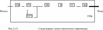 Структурная схема оптического приемника (ОПр) показана на рис.2.15. Приемник содержит фотодетектор (ФД) для преобразования оптического сигнала в электрический. Малошумящий усилитель (УС) для усиления полученного электрического сигнала до номинального уровня. Усиленный сигнал через фильтр (Ф), формирующий частотную характеристику приемника, обеспечивающую квазиоптимальный прием, поступает в устройство линейной коррекции (ЛК). В линейной коррекции компенсируются частотные искажения электрической цепи на стыке фотодиода и первого транзистора усилителя. После преобразований сигнал поступает на вход решающего устройства (РУ), где под действием тактовых импульсов, поступающих от устройства выделения тактовой частоты (ВТЧ), принимается решение о принятом символе. На выходе оптического приёмника имеется преобразователь кода (ПК), преобразующий код линейный в стыковой код.