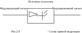 Прямая модуляция. При этом модулирующий сигнал управляет интенсивностью (мощностью) оптической несущей. В результате мощность излучения изменяется по закону изменения модулирующего сигнала (рис.2.9).