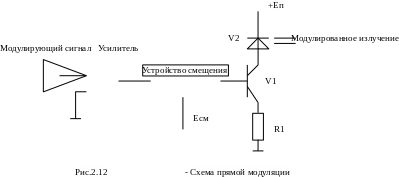 аиболее простым с точки зрения реализации видом модуляции является прямая модуляция оптической несущей по интенсивности на основе полупроводникового источника излучения. На рис.2.12 представлена схема простейшего прямого модулятора. Здесь исходный сигнал через усилитель подаётся на базу транзистора V1, в коллектор которого включен излучатель V2. Устройство смещения позволяет выбрать рабочую точку на ваттамперной характеристике излучателя.