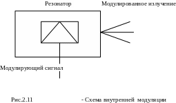 Внутренняя модуляция. В этом случае исходный сигнал управляет параметрами модулятора, введённого в резонатор лазера (рис.2.11).