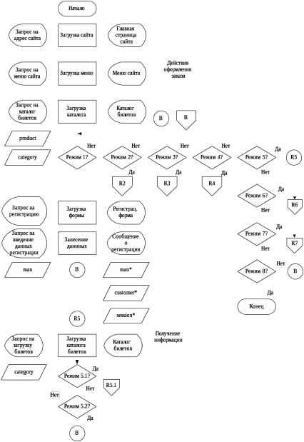 Задача реализована как последовательность страниц, которые загружает клиент. Задача решается поэтапными процессами (регистрации клиента, заказа билетов, подтверждения заказа). Кроме того для менеджера по продаже формируется реестр подтвержденных заказов тоже через этап идентификации менеджера и процесс формирования самого реестра. Последний использует расчетные формулы (2.1., 2.2.). Алгоритм решения задачи приведен на рис. 2.7.