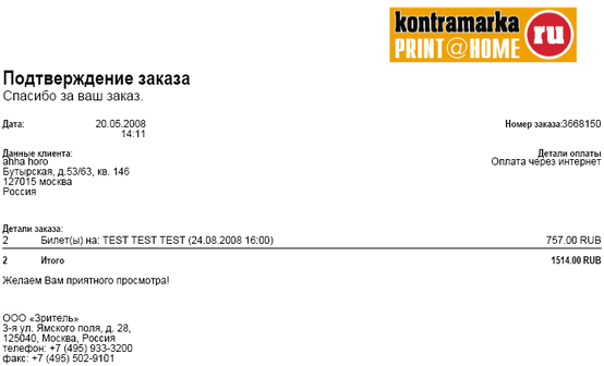 Рис. 2.10. Вид квитанции подтверждения заказа билета