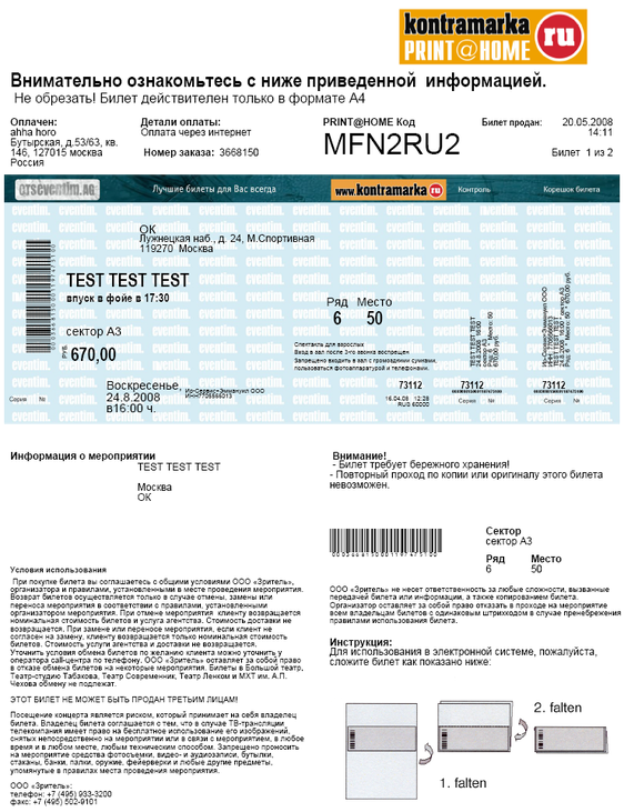 В качестве примера автоматизации реализации билетов можно привести результат работы ООО «Зритель», т.е. вариант билета и инструкции к нему (рис. 2.10., 2.11.).