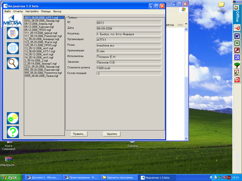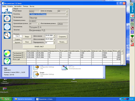 Режим «Создать» применяется для создания договоров. При создании договора требуется ввести данные в поля программы. Сначала заполняются поля группы «Общее» (вверху окна программы). Заполнение всех полей этой группы обязательно, иначе сохранение договора невозможно. Имеется всплывающая подсказка, объясняющая назначение каждого поля. Далее заполняются поля группы «Позиции». Выбираются нужные даты начала и окончания проката ролика при помощи встроенного всплывающего календаря. Устанавливается нужная периодичность выхода ролика в минутах. Все изменения будут видны в таблице. Программа позволяет при необходимости иметь несколько позиций в одном договоре. При нажатии кнопки «Создать» в группе «Позиции» создается новая позиция. Для редактирования созданных позиций можно воспользоваться кнопками «Вверх» и «Вниз». Номер текущей позиции и общее количество позиций отображается слева. Для удаления позиции нужно перейти на последнюю позицию и нажать на кнопку «Удалить». Для сохранения договора щелкните по кнопке «Сохранить» - договор сохранится в папку «MGFiles» в формате «дата заключения договора_имя организации.mgf». Для вывода договора на печать используется кнопка «Печать». Для просмотра прайс-листа компании используется кнопка «Прайс-лист».
