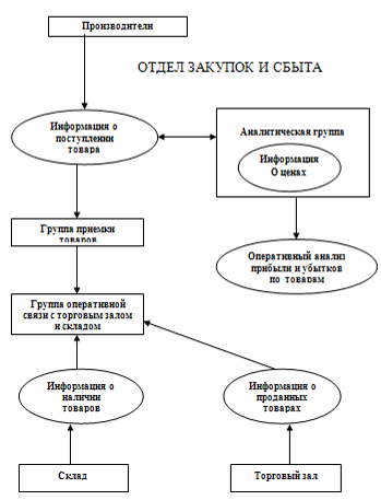 Каждый из менеджеров отвечает за определенные ему функции. Так, менеджер по закупкам отвечает за организацию поставок товаров, поиск поставщиков, прием товаров, слежением за товарными запасами. Менеджер по сбыту готовит необходимые материалы (бланки заказов и рекламную продукцию). Он же занимается приемом заказов от покупателей по телефону и в торговом зале офиса, контролирует деятельность склада, следит за отгрузкой товара и возвратами от покупателей, организационными вопросами, анализом деятельности. Информационные связи отдела закупок и сбыта представлены на рис. 2.
