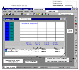 Рисунок 9 - Внешний вид главного окна контейнера TrendWorX32 с кратким описанием областей и органов управления