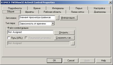 Диалог TwxView32 ActiveXControlProperties (называемый также диалогом свойств), изображенный ниже, является пользовательским интерфейсом для конфигурирования ActiveX элемента. Он вызывается двойным щелчком на ActiveX элементе в режиме разработки, и состоит из следующих страниц свойств: